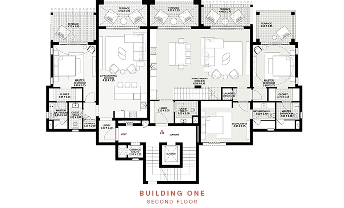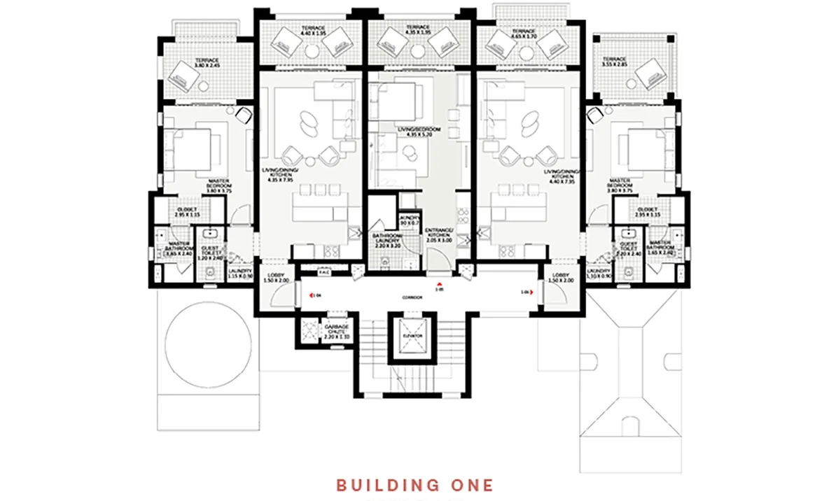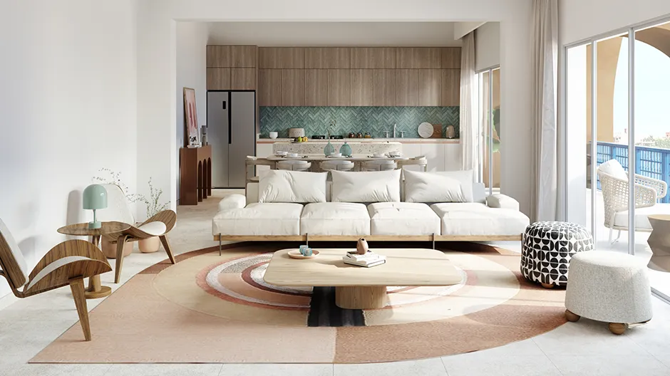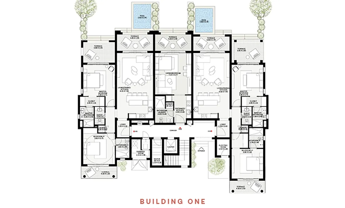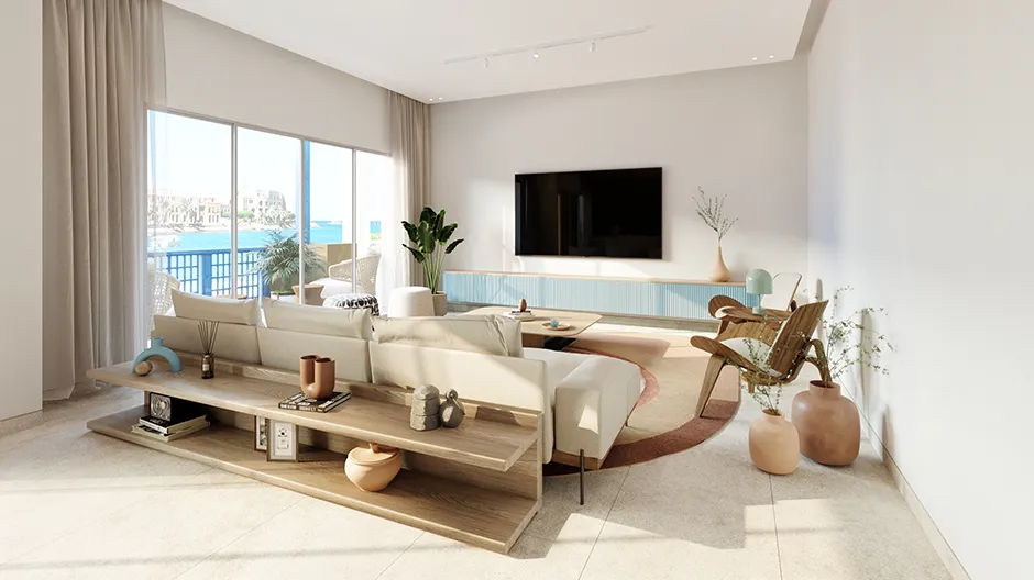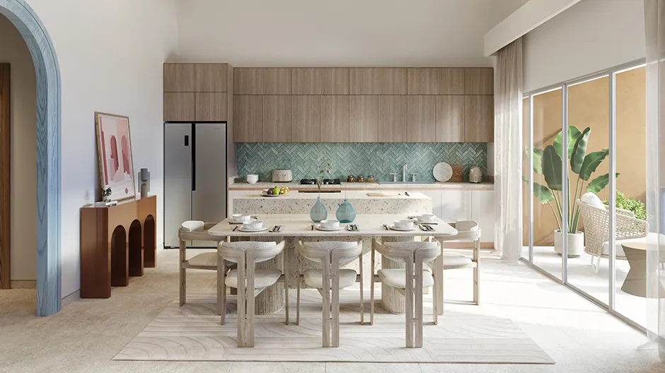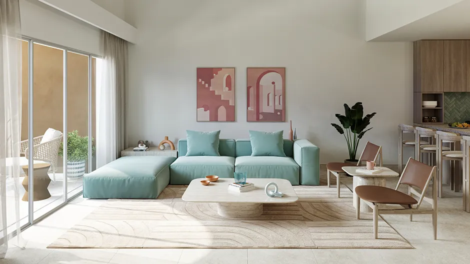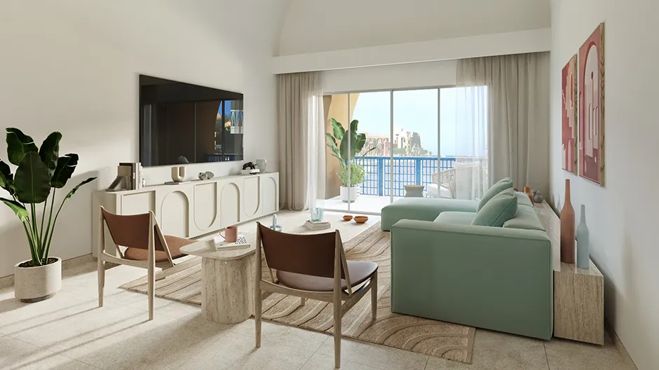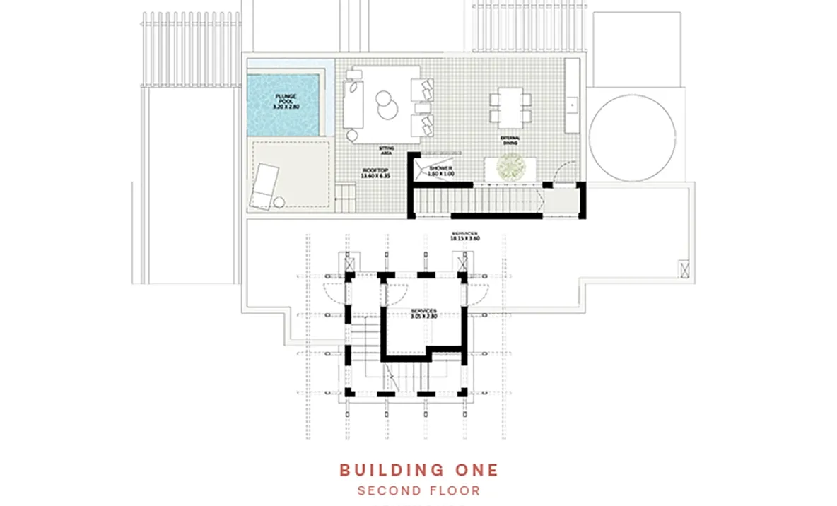 This exquisite three-story residence offers various living spaces, including studios and one and two-bedroom properties. The highlight is a spacious two-bedroom penthouse with a private plunge pool and rooftop terrace. All spaces feature balconies, terraces with sweeping views, and interiors bathed in natural light to create a warm and inviting ambience.